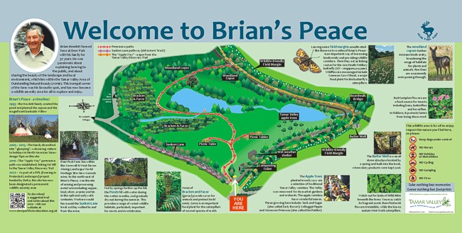 Brian's Peace Brian Howlett farmed here at Deer Park with his family for 37 years. He was passionate about explaining farming to the public, and about sharing the beauty of the landscape and local environment, which lies within the Tamar Valley Area of Outstanding Natural Beauty (AONB). This tranquil corner of the farm was his favourite spot, and has now become a wildlife amenity area for all to explore and enjoy. |